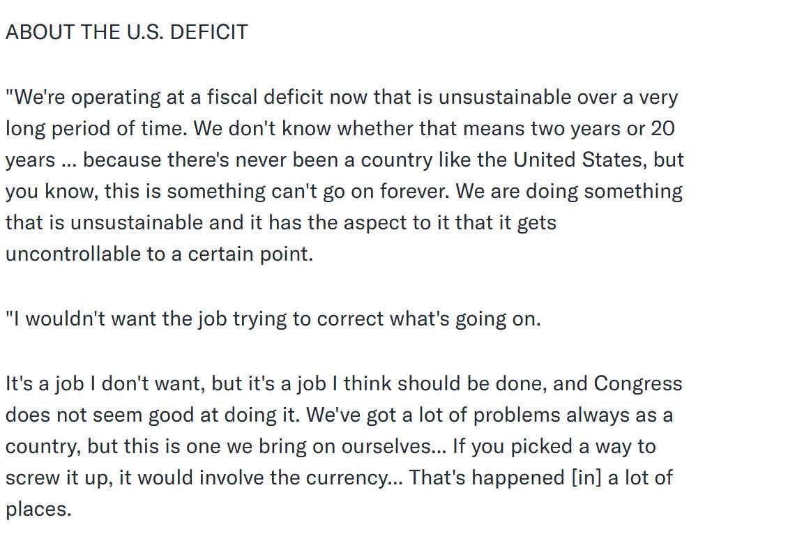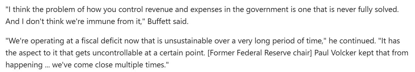 I thought the most telling moment in Buffet’s Q&A came when he talked about the unsustainability of the US deficit: